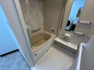 今回の施工はマンションの浴室リフォームです。今回は4Fと5Fのバスリフォームを担当させていただきました。バスタブはまるっと交換し、タイルを落ち着きのあるグレー系色に張替えました。清潔感がありお風呂にずっと浸かっていたい空間に仕上がりました。また、今回はその他のリフォームも依頼されているのでセット割引が適用された価格となります。